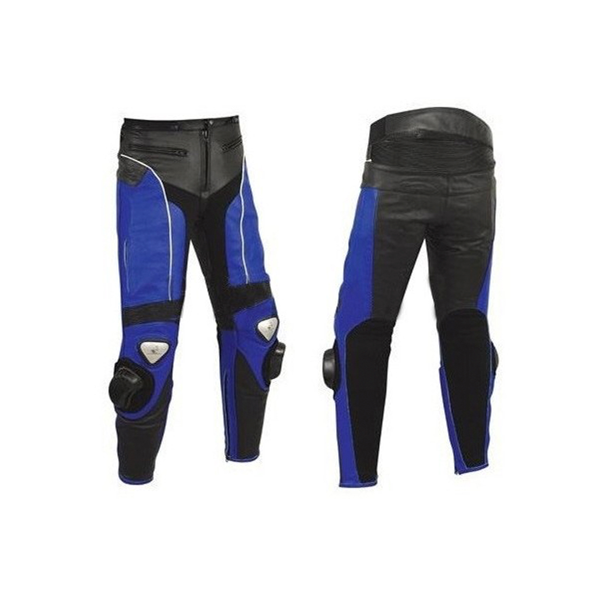 Black and blue bike pants. Splendid high-protection leather pantsspecially designed for bike pilots, these bike pants are equipped with armoured protections on the knees and hips as well as Kevlar protections on the inside of the leg.